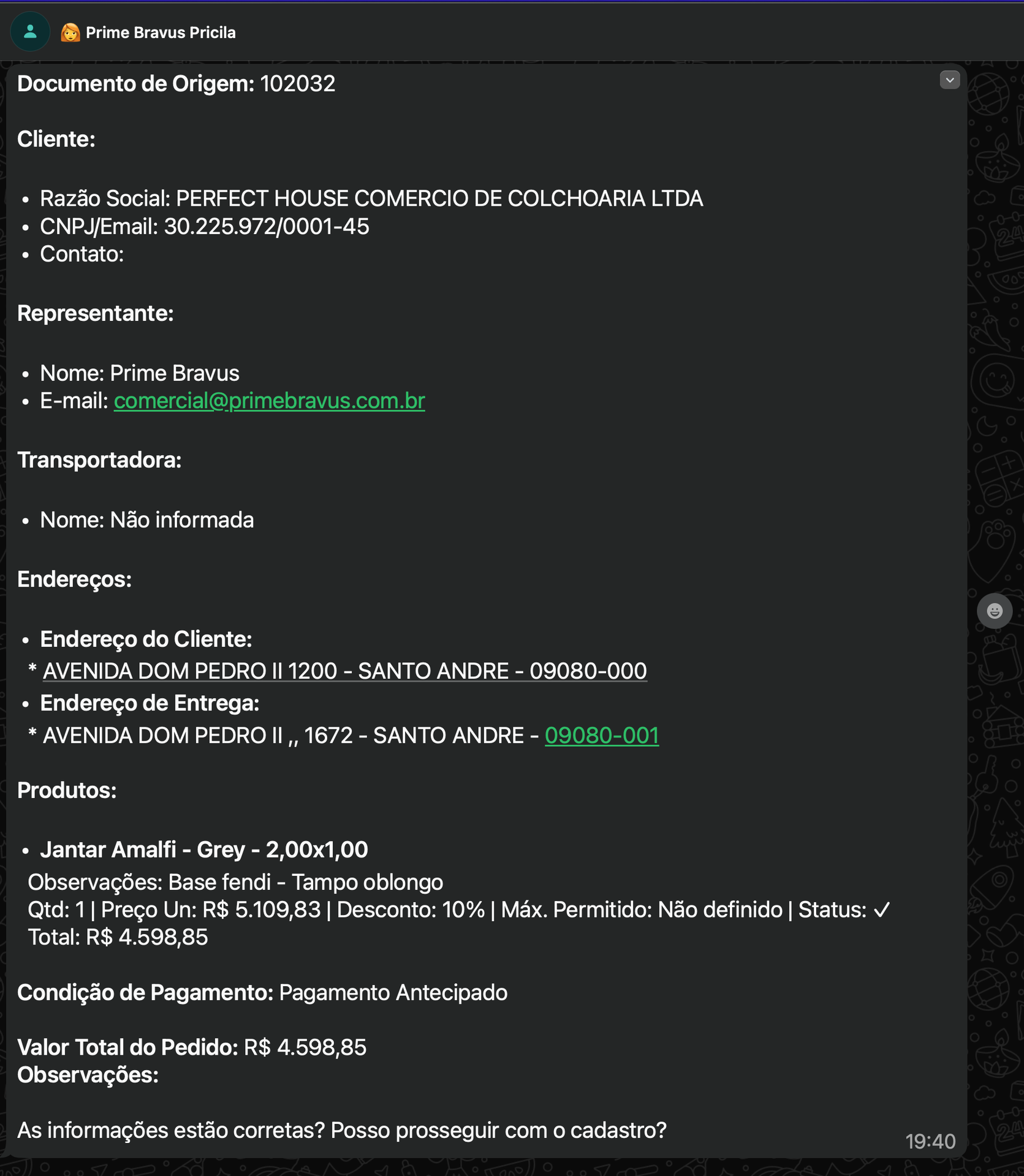 A Pri é a assistente da Prime Bravus para ajudar no recebimento de pedidos.Ela lê as informações enviadas no WhatsApp, valida os dados no sistema e monta um resumo para sua confirmação antes de cadastrar o pedido.