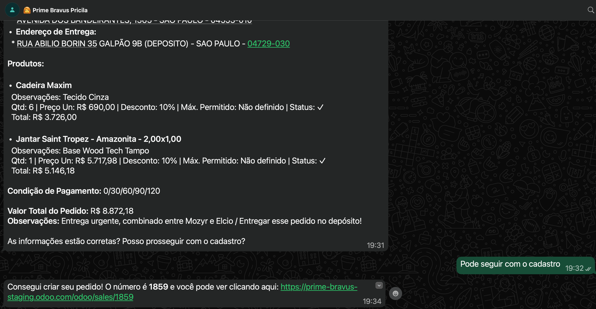Após sua confirmação, o pedido é cadastrado no Odoo.